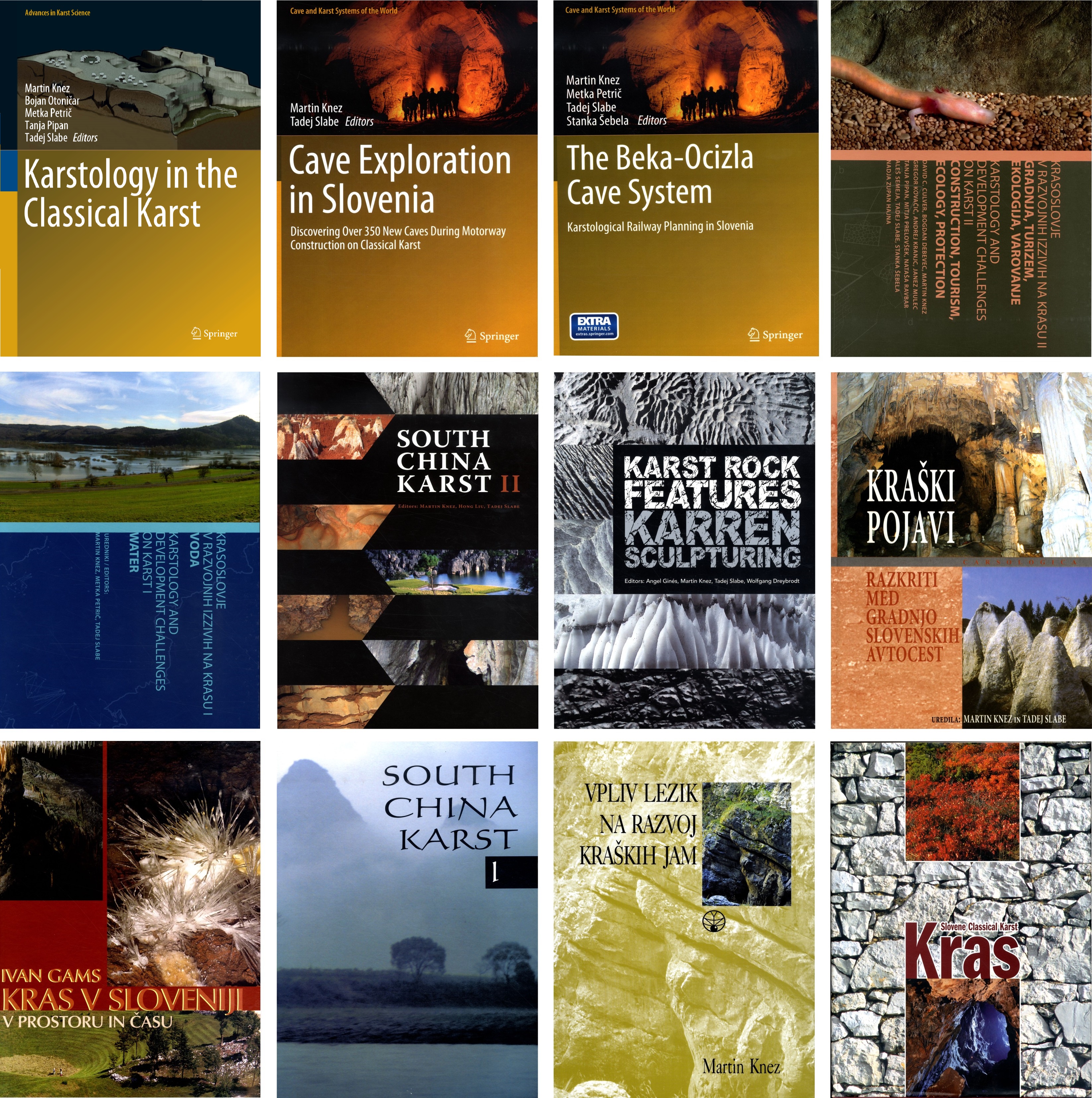 KNEZ, Martin, SLABE, Tadej, GABROVŠEK, Franci, KOGOVŠEK, Janja, KRANJC, Andrej, MIHEVC, Andrej, MULEC, Janez, OTONIČAR, Bojan, PERNE, Matija, PETRIČ, Metka, PIPAN, Tanja, PRELOVŠEK, Mitja, RAVBAR, Nataša, ŠEBELA, Stanka, ZUPAN HAJNA, Nadja, BOSÁK, Pavel, PRUNER, Petr, LIU, Hong, KNEZ, Martin, SLABE, Tadej. Cave exploration in Slovenia : discovering over 350 new caves during motorway construction on classical karst, (Cave and karst systems of the world). Cham: Springer, 2016. XIII, 324. ISBN 978-3-319-21203-6. ISBN 978-3-319-21202-9. http://www.springer.com/gp/book/9783319212029, DOI: 10.1007/978-3-319-21203-6. [COBISS.SI-ID 39082541]